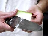 2 皮を包丁でこそげ取り、面取りをして、皮目に深さ5mmくらいに細かく包丁目を入れる。