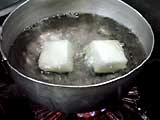 4 20分後に、湧いた湯の中に入れ柔らかくなるまで (約10分) 湯がき、氷水におとす。(下ゆでの段階で柔らかくしておくと、味がしみ込む)