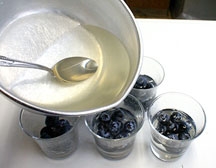 5. グラスにブルーベリーを入れて、ゼリー液を注ぎ、冷蔵庫で冷し固めます。(写真4)