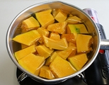 3. かぼちゃは皮と種をとって一口大に切ります。(写真3)