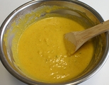 6.  バター生地にかぼちゃ、アーモンドパウダー、生クリームを加えて均一な生地になるまで混ぜ合わせます。(写真6)