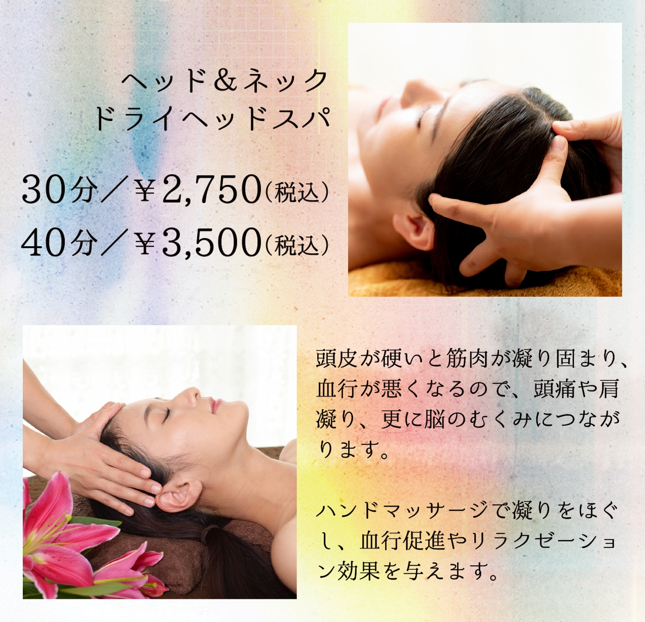 ♦ヘッド&ネック(30分) ¥2,750(税込) ♦ヘッド&ネック(40分) ¥3,500(税込) 頭皮が硬いと筋肉が凝り固まり、血行が悪くなるので、頭痛や肩凝り、更に脳のむくみにつながります。ハンドマッサージで凝りをほぐし、血行促進やリラクゼーション効果を与えます。 ※ドライヘッドスパとなります。