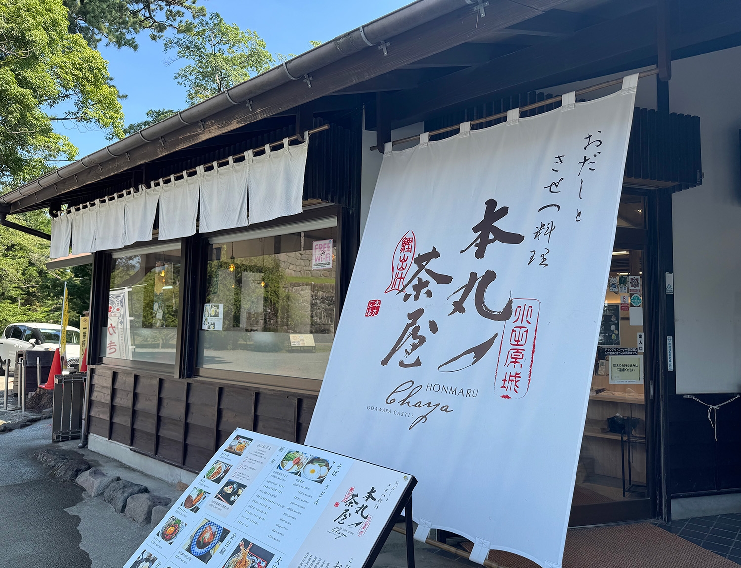 お店は小田原城址公園内、お城を臨む絶好の場所にあります。こだわりの味をお手ごろな値段でご案内しております。お気軽にお立寄り下さい。