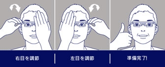 フレームの左右にある調節ツマミで度数調整するだけで、すぐ使えます。