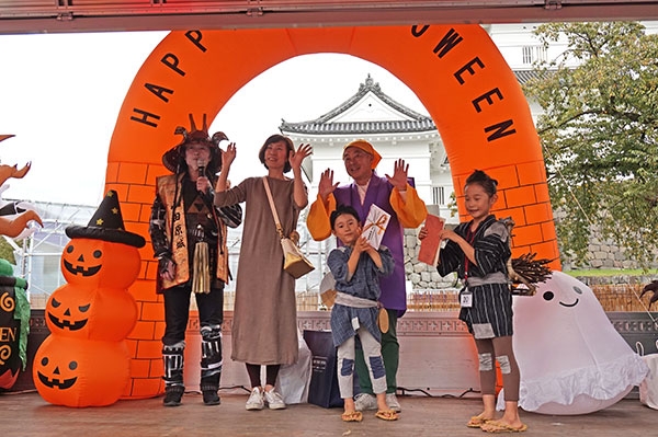 仮装パレードは、小田原城の馬出門から正規登城ルートを通って本丸広場まで練り歩きました。豪華賞品が用意された仮装コンテストは、メイン会場に敷かれた長いレッドカーペットの上を仮装した参加者がパフォーマンスをしながら歩きました。栄えあるグランプリに輝いたのは、薪を拾いながら歩いた「銅像の二宮金次郎さんが歩いた~!」チームでした。