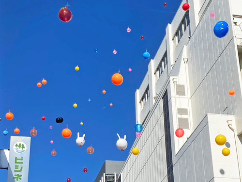 商店街の上空に、干支や季節をイメージしたかわいいバルーンを飾っています。お買い物や観光にお越しの際は車に注意して、ぜひ空を見上げてみてくださいね。